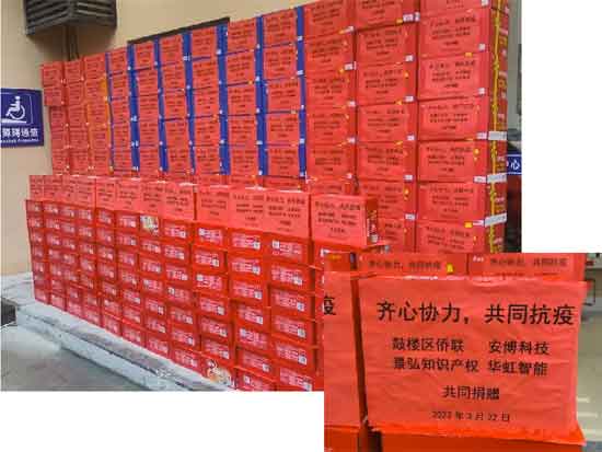 3月22日下午,在鼓樓區僑聯的帶領下,華虹智能與安博科技、景弘知識產權一起,向五鳳街道的一線工作人員,捐獻了方便面、八寶粥共計260箱。希望通過實際行動,共同筑牢疫情防線,為打贏疫情防控阻擊戰貢獻一點綿薄之力。