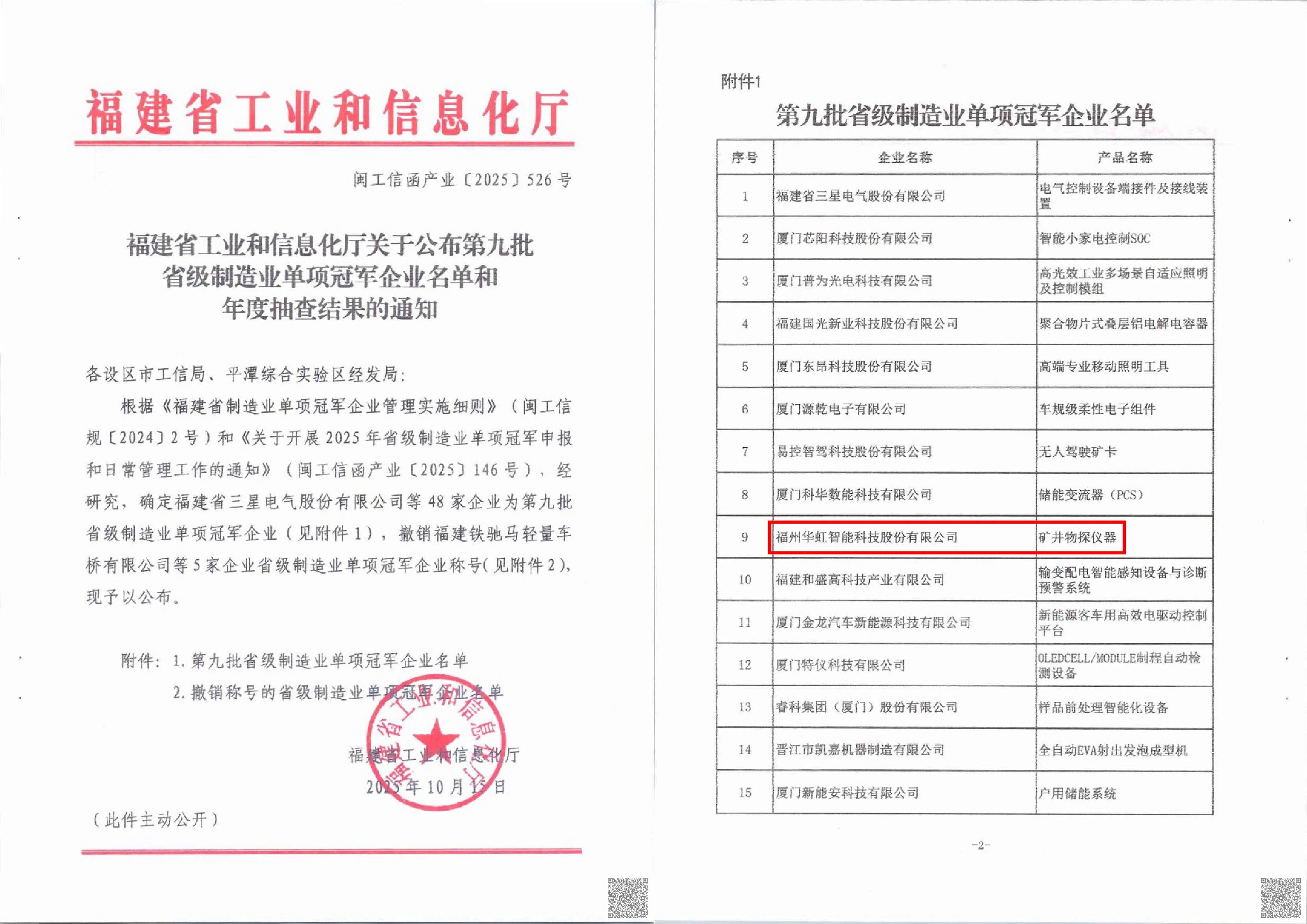 近日,福建省工業(yè)和信息化廳發(fā)布《關(guān)于公布第九批省級制造業(yè)單項(xiàng)冠軍企業(yè)名單和年度抽查結(jié)果的通知》(閩工信函產(chǎn)業(yè)[2025]526號),福州華虹智能科技股份有限公司憑借“礦井物探儀器”成功入選第九批省級制造業(yè)單項(xiàng)冠軍企業(yè)名單,彰顯其在該細(xì)分領(lǐng)域的領(lǐng)先實(shí)力。